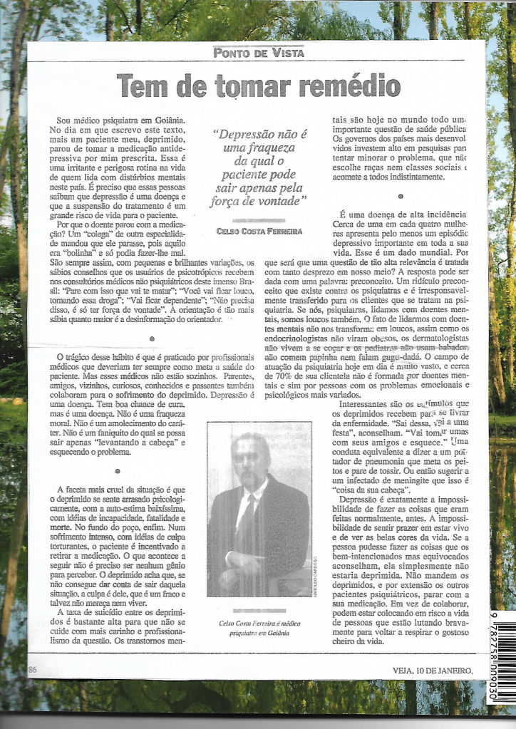 Numa publicação da Revista Veja de 1996, o Dr Celso Costa Ferreira, médico psiquiatra, discutiu o tema de uma forma muito clara. Guardei o artigo por todos esses anos e vejo que os problemas que anteriormente as pessoas demonstravam para aderir ao uso de medicamentos continuam até hoje. Procurei-o para solicitar sua permissão para publicar seu artigo, mas infelizmente ele já é falecido. Então, a publicação deste texto fica como uma homenagem a ele. A imagem não está íntegra, mas a mensagem é muito importante! Vale a pena ler!